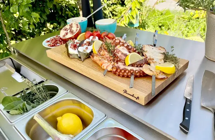 The Block M is an outdoor kitchen module made of 100% stainless steel in the identical base area and colours of the Block D, offering numerous storage options for accessories, a waste bin and a convenient solution for the preparation of ingredients. Even at a huge 130 kilograms, Block M remains mobile on four swiveable heavy-duty castors. Four stable feet ensure firm footing and optimal alignment. Inside, there are practical drawers and containers of very high quality. A matching cutting board/serving tray is also included. The outdoor kitchen module is topped off with a solid 4mm stainless steel plate - ideal for preparation and serving. The Block M is supplied fully assembled and perfectly complements the barbecues of the Block series in style and function.
